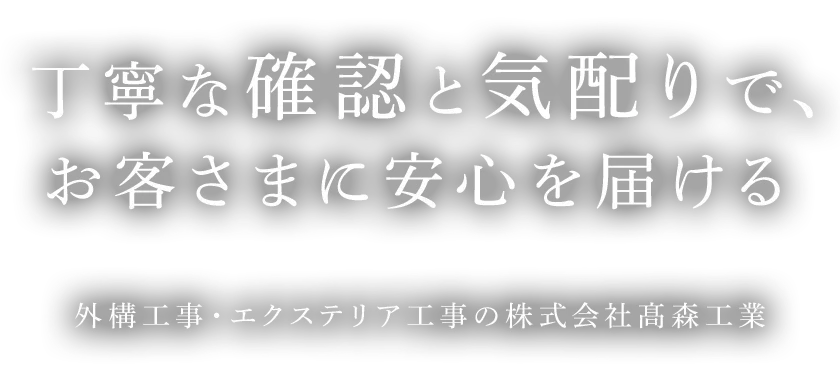 埼玉県内を中心に外構工事・エクステリア工事を手がける株式会社髙森工業です。設計・施工・メンテナンス(点検)・アフターフォローに一貫対応しています。戸建てや店舗の新築・リフォーム・改修にともなう施工は、ぜひ弊社にお任せください。図面作成(3DCAD)も有償で承っております。